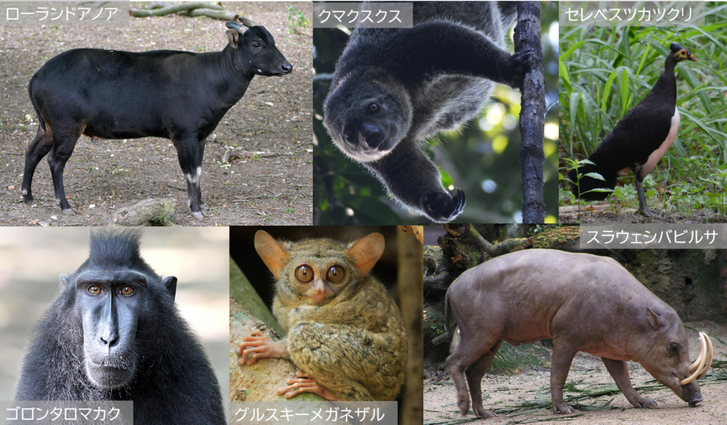 スラウェシ島・ゴロンタロ州に生息する生き物:ゴロンタロマカク(©ヘンリック・イシハラ)、スラウェシバビルサ(©Masteraah)、ローランドアノア(トップ画像、本文©The Land)、クマクスクス(© ꦥꦤ꧀ꦗꦶꦒꦸꦱ꧀ꦠꦶꦄꦏ꧀ꦧꦂ)、セレベスツカツクリ(©Ariefrahman)、グルスキーメガネザル(©Meldy Tamenge)(いずれも、クリエイティブコモンズから取得)