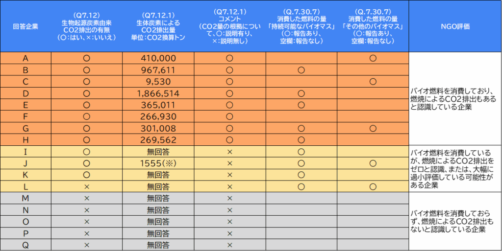 なお、J社が回答した燃焼によるCO2排出量はわずかですが、J社は大規模な石炭バイオマス混焼発電所を複数操業する大手発電事業者であることを考えると、数値の妥当性には疑問が残ります。