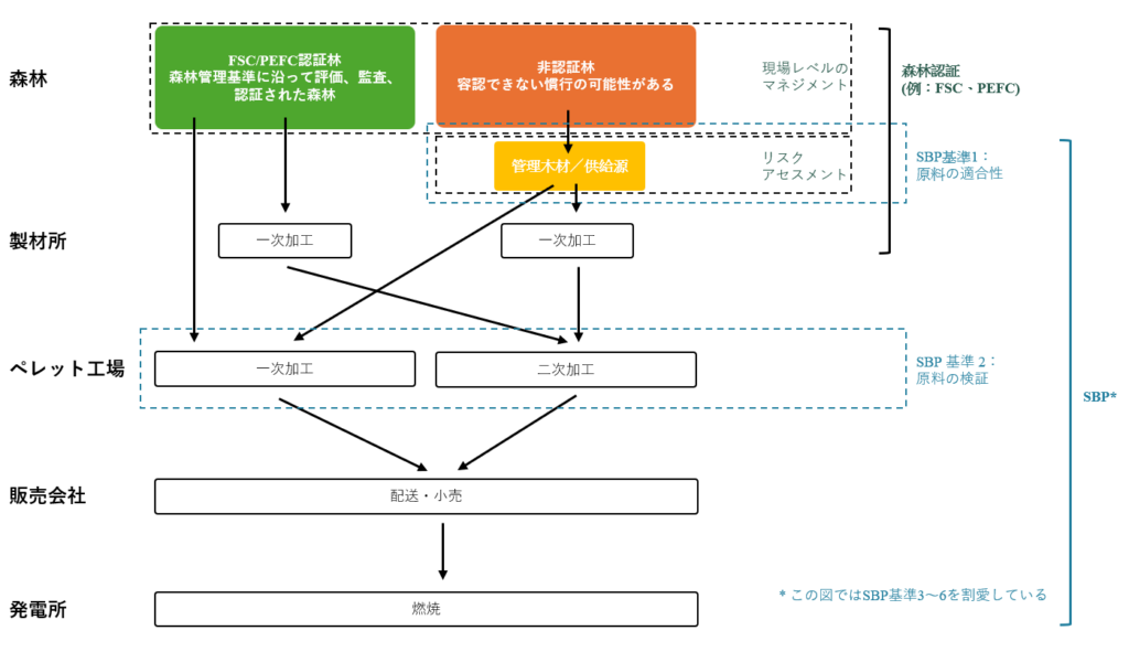 自ら認めているように、SBPは森林認証制度ではない。SBP基準1は、検証手続きを定めたSBP基準2に対して認証を求めるバイオマス生産者のサプライベース(供給拠点。通常はペレット工場)のみに適用される。